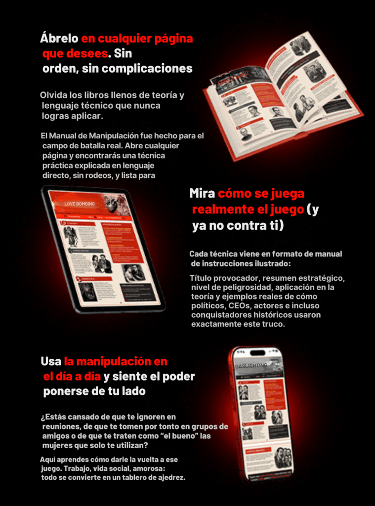 El único Manual ilustrado con técnicas prohibidas que te muestran cómo manipular a cualquier persona —mujeres, tu jefe, tu familia o tus amigos— en cualquier lugar, sin que ellos sepan por qué. Incluso si eres tímido, poco atractivo o pobre.